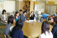 ▲学校見学で生徒の話を聴く